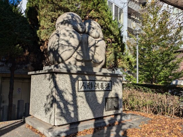 こちらの2人の童子が寄り添うような石碑は人形塚。写真で見るよりも大きく、その高さは2m以上あります。ここは人形を納め供養する場所。毎年10月第1木曜日にはこの碑の前で「人形供養祭」が執り行われるそうです。