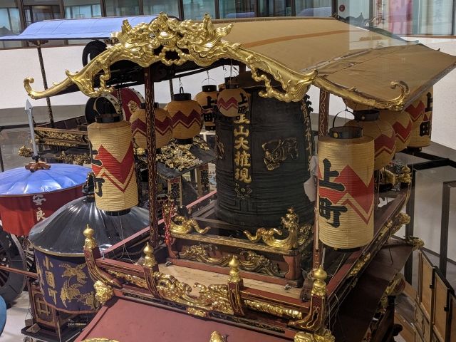 大町のおしゃぎりは、上町に比べるとシックな印象。ですが、やはりこちらも金色の彫刻がたっぷりとあしらわれています。青い屋根は現在修理中とのことです。