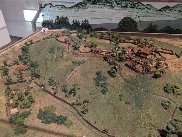 こちらも同じく村上城の模型ですが、戦国時代の姿を再現したもの。調査によると、この頃はまだ石垣が組まれておらず、建築はすべて木造、屋根は茅葺きか板屋根であったそう。
