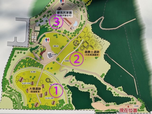 園内の見どころは「①大塚遺跡」、「②歳勝土遺跡」、「③都筑民家園」の3エリア。