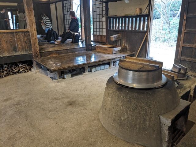土間には大きな竈門が。内部では様々なイベントも開催されており、訪問時は「南京玉すだれの実演見学」が開催中でした。