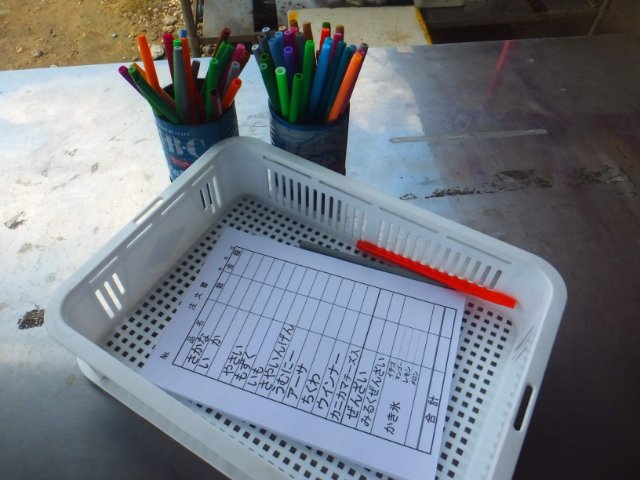 注文は紙に書いて渡すスタイル。アーサ、もずく、さかななど、沖縄らしい天ぷらがそろっています。お値段は全て80円。