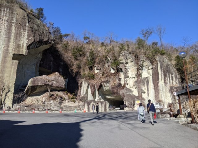 駐車場から歩いていくと、立ちはだかる巨石。この時点で既に迫力満点!巨大な岸壁に空いた穴は自販機が並ぶ休憩所となっています。