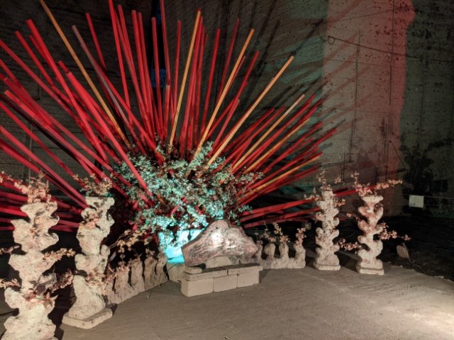 突然現れる植物のアート作品。こちらは、2019年に行われた「假屋崎省吾の世界展」にて展示されていた作品が寄贈されたもの。刺激的な作品は、地下空間に潜むモンスターのようです。