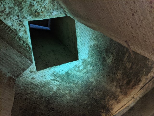 天井を見ると真四角の穴が空いています。こちらは立杭と呼ばれており、ここが地表のどの位置であるかを判別するために掘られたそうです。照明の効果も相まって、異世界へのワープホールのような存在感。
