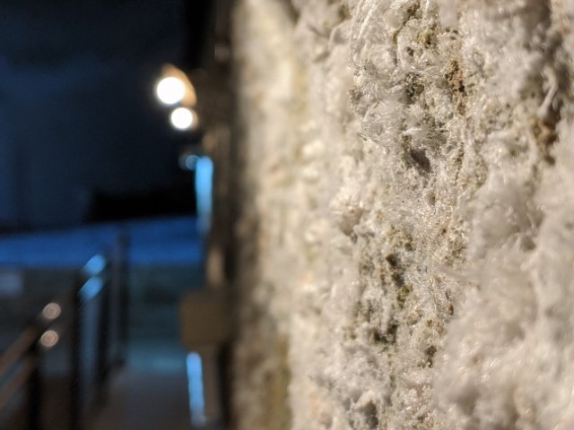壁にはフワフワした白い結晶が現れている。こちらは、石に含まれる塩分が吹き出したもので、石の華と呼ばれています。夏場は消滅してしまうため、冬にしか見ることができないそう。