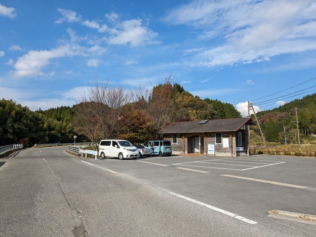 通潤橋より車で約10分。円形分水の少し手前にトイレ付の駐車スペースがあり、ここから徒歩1分ほど。