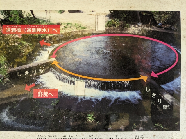 湧き出した水はまず「内円筒」に溜まり、その後「外円筒」にあふれ出ます。「外円筒」は2つに区切られており、広い部分は通潤橋へ渡り白糸台地へ、狭い部分は野尻、笹原地区の水田へと流れます。