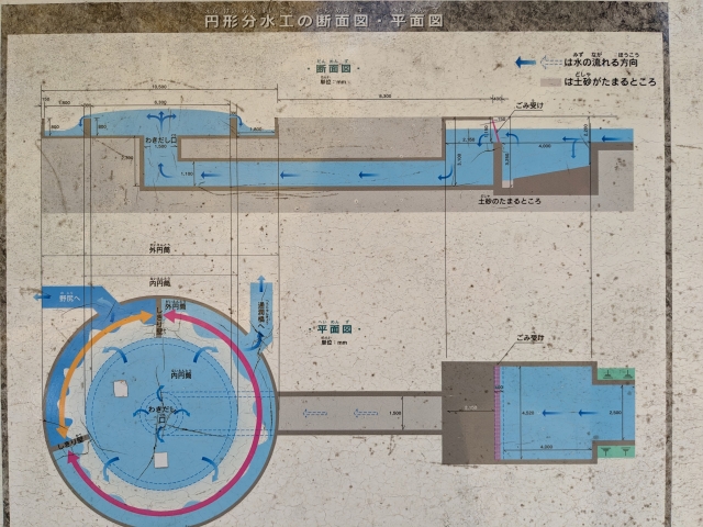 気になるのは、この円形でどうやって水を分けるのかということ。この円形分水の内部は「内円筒」と「外円筒」という2つの水槽に分かれています。