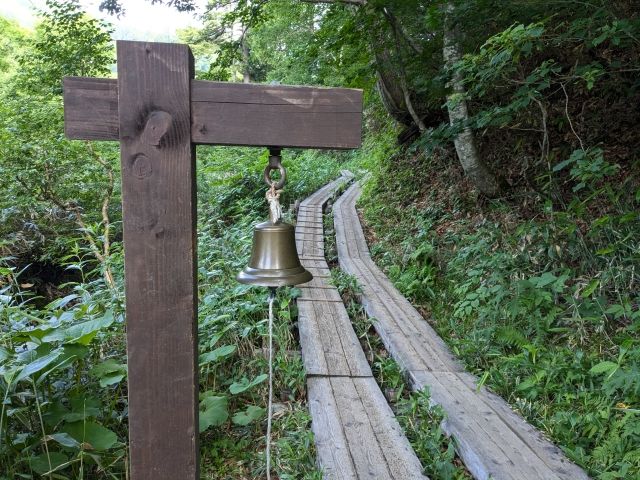 謎の鐘を発見しました。鳴らしてみると澄んだ音色が森に響き渡って、なんだか清々しい気持ちに。この後も何ヶ所かにあり、どうやら熊除けのようです。