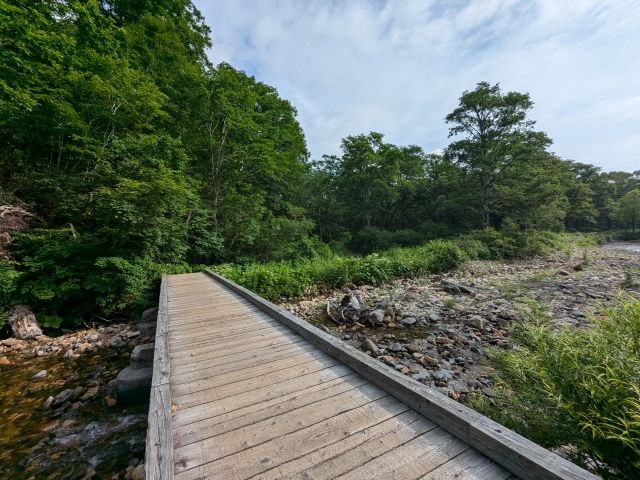 道が開けてくると、川上川に架かる橋が姿を現します。欄干が無いのでちょっとどきどきしますが、高さはそれほどでもないのでご安心を。