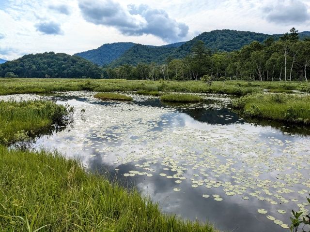 「池塘(ちとう)」というコトバをご存じでしょうか?これは、湿原にできる池や沼を指します。尾瀬ヶ原には、そんな池塘がたくさん。「オゼコウホネ」という水生植物もたっぷりと浮かんでいます。