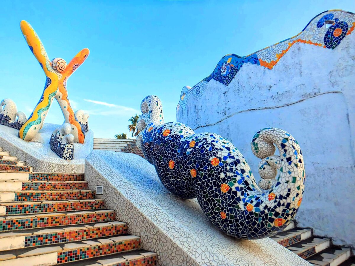さすがにスペイン村にサグラダファミリアはありませんが、ガウディ作のグエル公園をモチーフにしたグエル広場があります。白く波打つ外観と、モザイクタイルによる装飾は、本家そっくり。