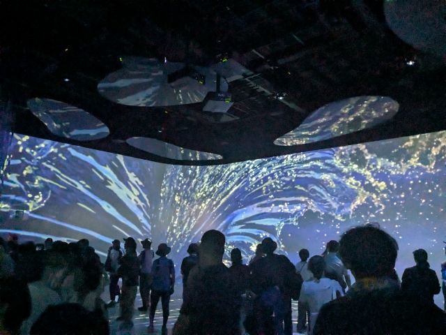 海の部屋を抜けると、次の部屋はシアタールーム。幅20m・高さ5mほどの波打つ大型スクリーンが左右に設置された没入感のある部屋です。