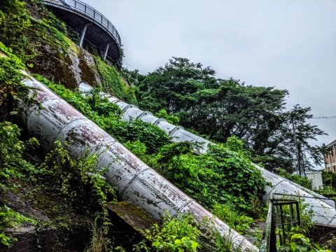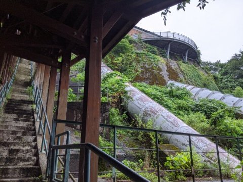 先ほど館内で見かけた真っ暗なトンネルは、このパイプに接続している様です。きっと発電用の水を流すための導水管ではないでしょうか。