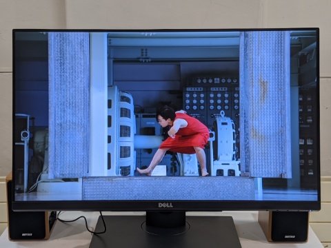 さらに舞踏家の奥村万琵(おくむら ばんび)さんとのコラボレーションも開催中。赤い服をまとった姿が、発電所の無骨な背景の中映える。本日は映像による展示ですが、タイミングが合うと実際に生で舞踏を見ることもできるそう。