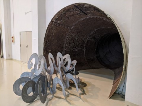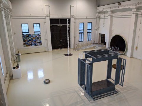 2020年7月18日〜8月16日の期間は埼玉県在住の彫刻家・晴柀幸一(はれまき こういち)さんの作品を展示中。無機質な作品群は、まるで初めからそこにあった発電所の部品のように空間に溶け込みます。