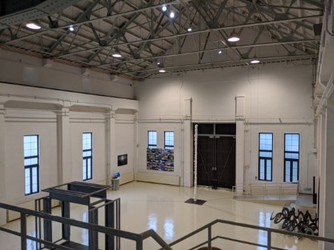 白い壁に包まれた清潔感あふれる展示室。天井までの高さは10mとかなり広い空間なので、大きな作品でも問題無く展示可能です。