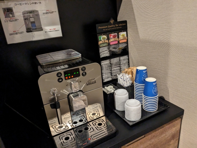 コーヒーはフリー。お茶のティーパックもここにあるので、気になるものがある場合はもらっていきます。