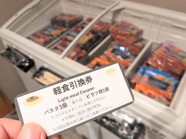 受付の際に軽食引換券をいただけます。これは、パスタとリゾットの冷凍食品から好きなタイミングでひとついただけるというもの。