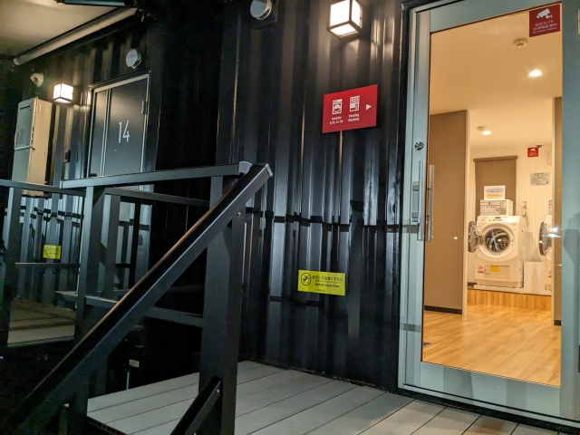 敷地内には、コインランドリーのキャビンもあります。利用時間は6:00~24:00、洗濯乾燥機で3kgまで120分800円〜。長期滞在も可能です。また、自動販売機もランドリーのそばにあります
