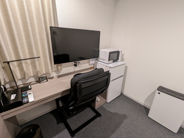 そこに加えて、電子レンジ、加湿空気清浄機まで設置されています。さらにデスクの椅子はなんとマッサージチェア!長旅で疲れた身体の疲れをほぐしてくれます。