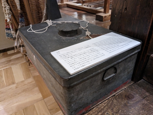 再現された民家に置かれたブリキ製の箱は、「フネ」という川に浮かべる冷蔵庫。まちなかにせせらぎがあふれる三島ならではのアイテムです。紐をつけて流されないようにしていましたが、それでも流れることは多々あったそう。「下流の子供には流れてくるのが楽しみだった」、そんなエピソードも添えられていました。