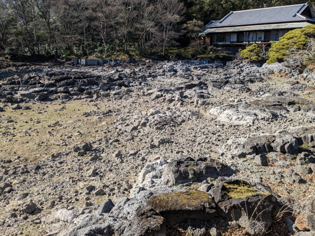 この楽寿園がある場所は、約1万2千年前に富士山噴火で流れ出た三島溶岩流の末端にあたる場所。小浜の森をはじめとした園内各所にて様々な溶岩を見ることができます。