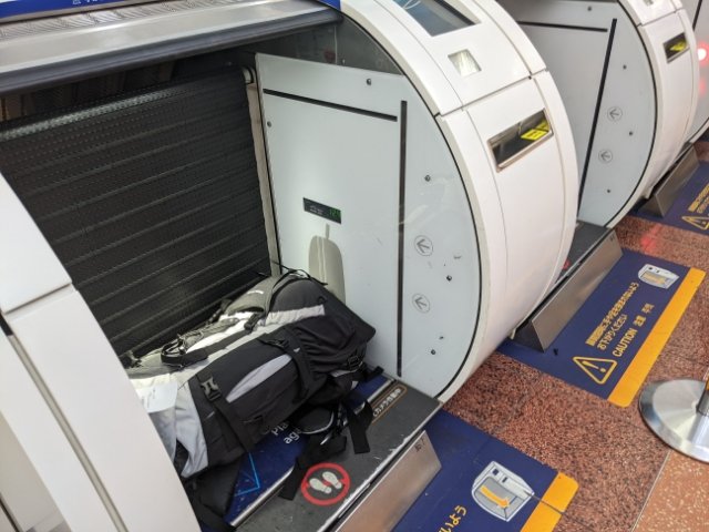 タグを付けた場所が悪かったのかぜんぜん受け取ってくれません。何度も繰り返しているうちに、バックパックの紐が機械に巻き込まれてしまい、機能がストップ。スタッフさんを呼んだところ、業者さんしか対応ができないのでしばらくお待ちくださいモードに。