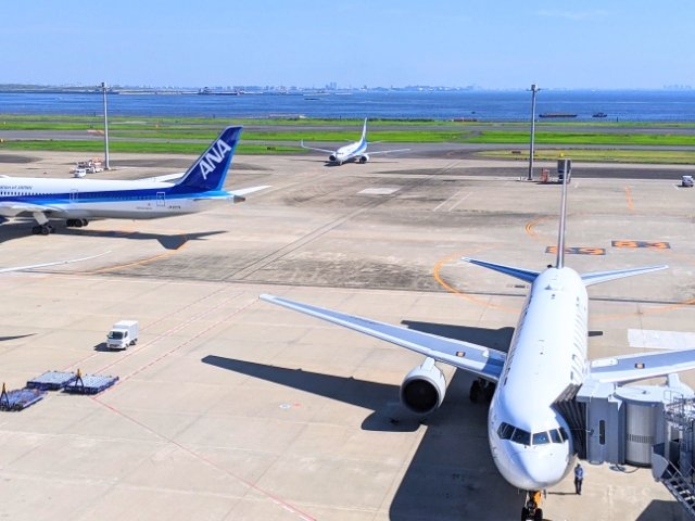 ANAの青い機体がズラリ。さらにバックに広がるグリーンの芝生とブルーの海のコントラストがあざやか!南国気分でテンションが上がります。