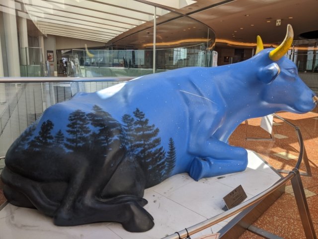 展望デッキの近くで謎の青いウシを見つけました。こちらは千住博さんの作品「MOOON」。空港内には、他にも多数の千住博作品がパブリックアートとして設置されています。