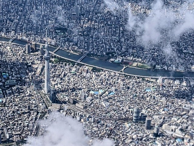 今回は進行方向「左側」の窓際席をキープ。空へと飛び立った機体の窓からはまるでミニチュアのような東京の街並みが広がります。高くそびえるスカイツリーはやっぱり近未来感ありますね。