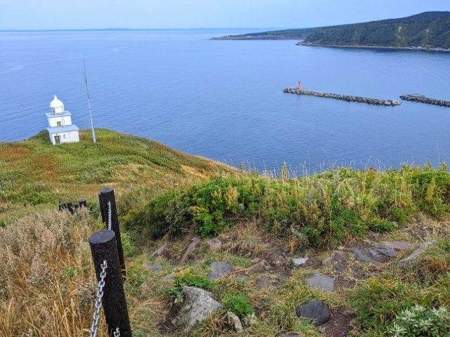 道路から約20分ほどで山頂に到着!大海原と真っ白な鴛泊灯台が見渡せます。吹き抜ける風が心地よくて、登ってきた疲れも吹っ飛びます。