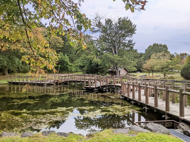 神社のすぐ近くには修景池があります。橋や水車がおだやかで趣深い。池の中をのぞくと、立派なニシキゴイがたくさん泳いでいます。池の周辺は公園になったおり、散歩したりベンチで休んでいる人の姿が。きっと憩いの場なのでしょうね。
