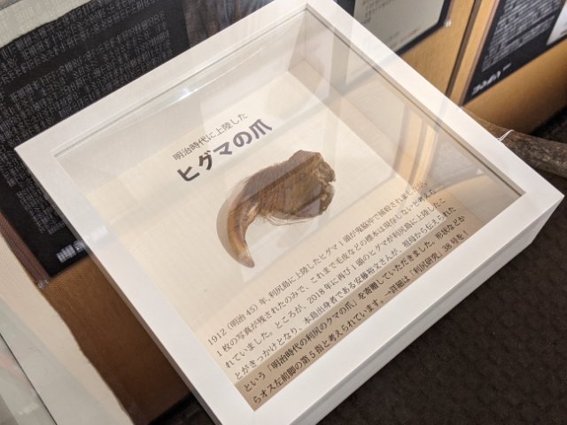 唐突に現れるのは「ヒグマの爪」。利尻にヒグマは生息していませんが、1912年に海を越えてきた個体がおり、この爪はその個体のものとのこと。2018年に106年ぶりのヒグマ出現をきっかけに、博物館に寄贈されたそうです。