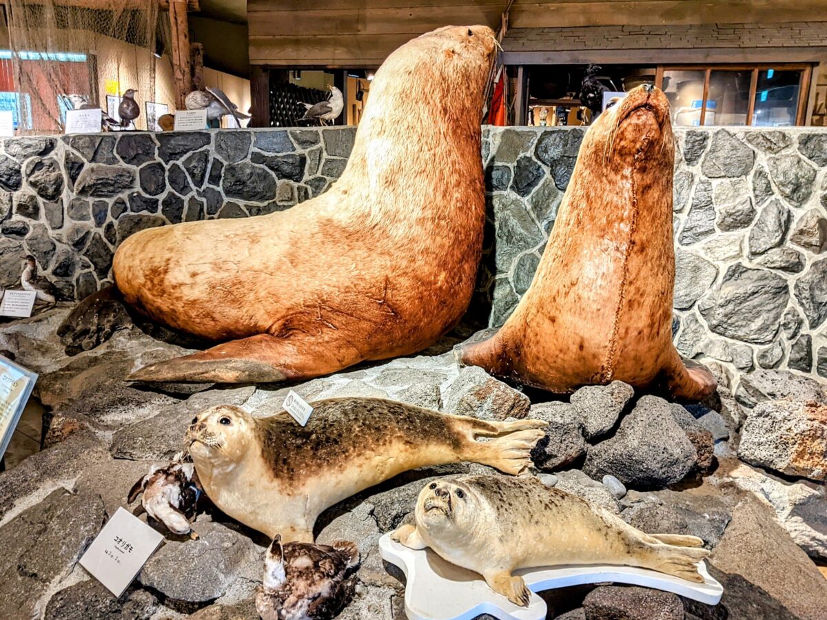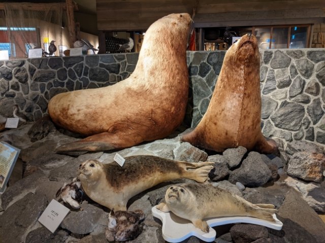 目を引くのは大きな剥製。トドやゴマフアザラシなど、利尻島で見ることができる生き物が剥製として展示されています。