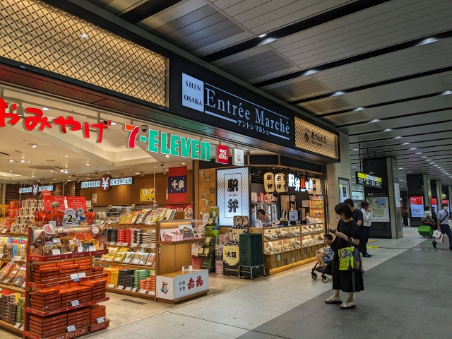 そして、そのすぐそばにあるのが、アントレマルシェ。新大阪駅や三ノ宮駅、新神戸駅など関西各主要駅で見かけるお土産屋さん。もれなくセブンイレブンと融合しています。