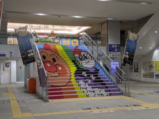高知駅のトイレで身支度を整えます。レンタカーの貸し出し時間である9:30まではまだ時間があるため、少し駅周辺散策へ。ホームへ向かう階段は、アンパンマンが描かれたカラフル仕立て。駅構内に鳴り響く発車メロディもアンパンマンです。