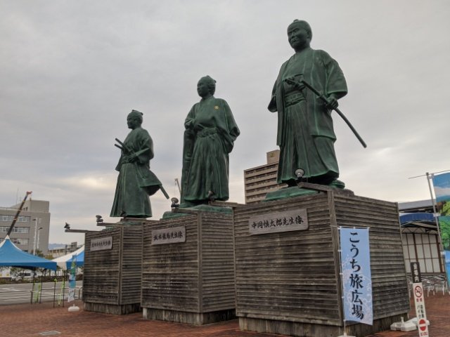大きな3体の銅像も。こちらは坂本龍馬、中岡慎太郎、武市半平太。幕末を代表する土佐の英雄たちは、令和となった今日も人々を見守っています。高知って銅像や石像が他県よりも多い気がするのですが、気のせいでしょうか。