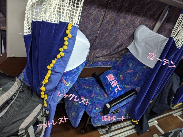 真ん中シートの1番前、カーテンは無く休憩の旅に人通りと冷気で起こされるという悪席に当たってしまいました。ほぼ眠れなかったので、次からは座席指定できるバスにすることを誓いました。