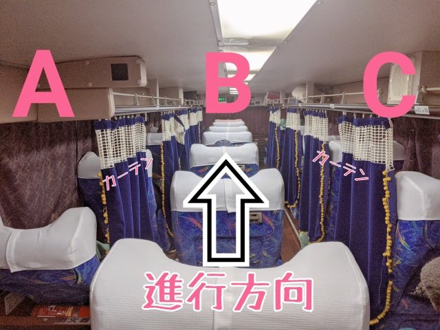 JRの2階建てバスは、左からA列B列C列となっているのですが、真ん中のB列にはパーソナルなカーテンがありません。A列、C列がカーテンを閉める中、吹きさらし状態になります。