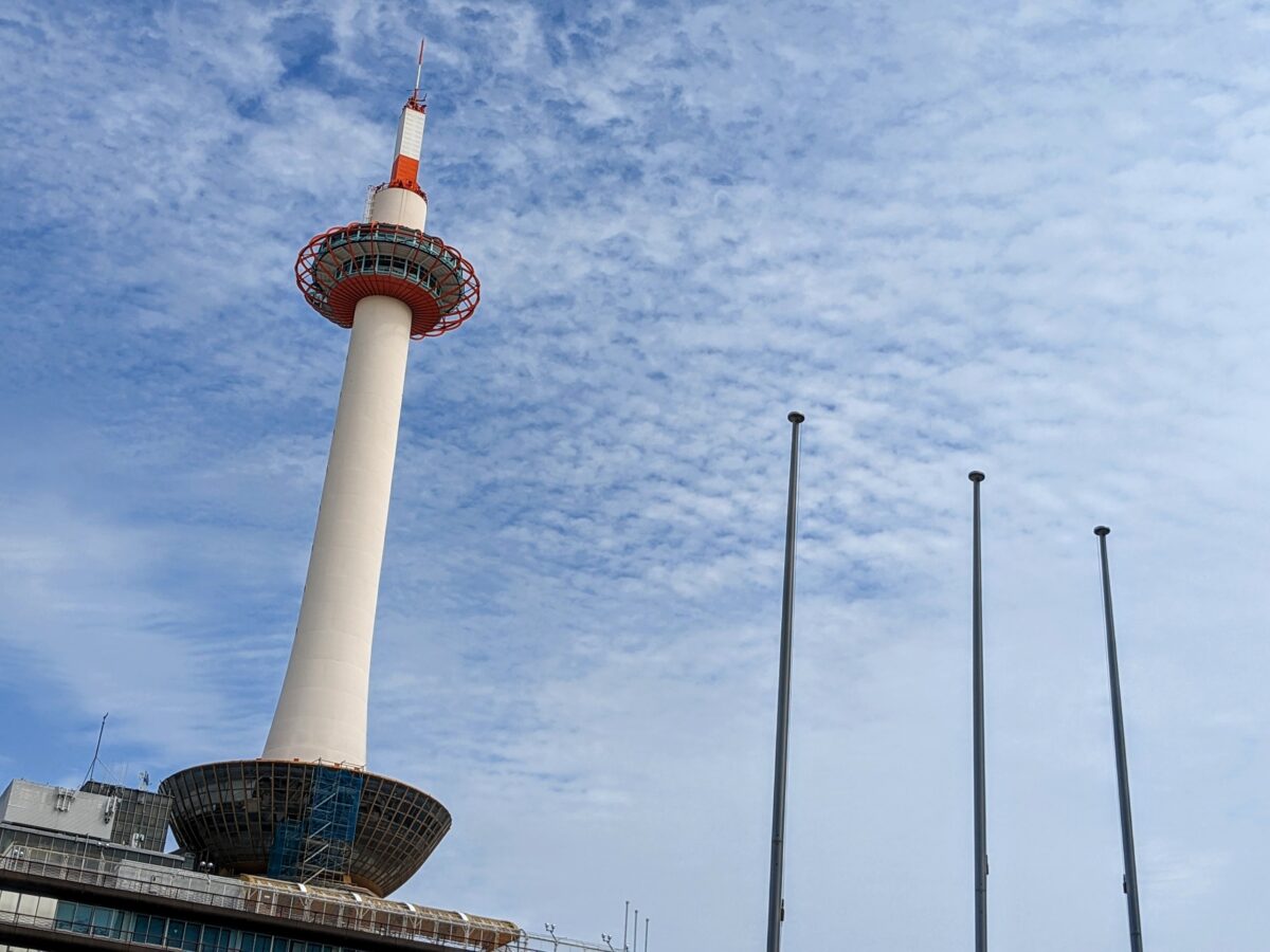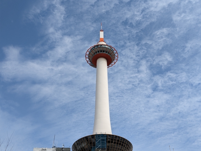 烏丸口を出ると目に入るのは京都タワー。京都駅とこのタワーを見ると、京都に来た実感がわいてきます。