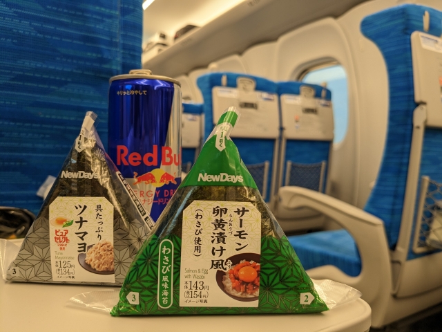 ということで、無事乗車完了。自由席の混雑を見て冷やっとしながら指定席へと座りました。さっそくですが、東京駅のNewDaysで買ったおにぎりとレッドブルきめます!