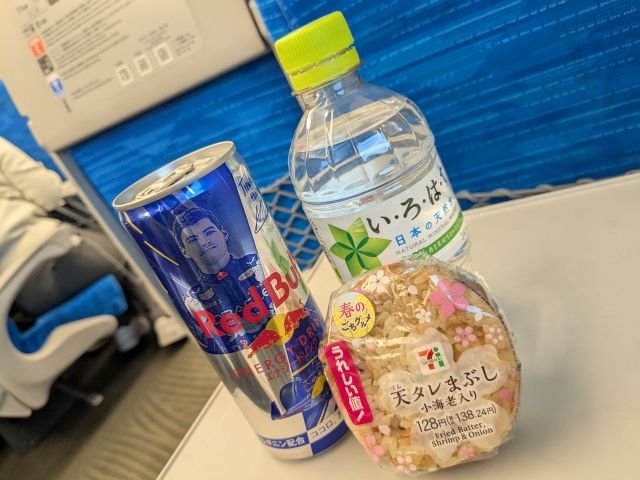 定刻になると、静かに動き出す車両。朝ごはんはセブンの「天タレまぶし」おにぎり。めっちゃ美味しいと話題だったので買ってみました!旅行はじまりのレッドブルはもはやデフォルトです。