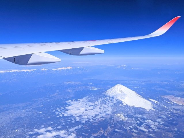 すぐに富士山の登場!かつては見ることができませんでしたが、今は横田空域を通過できるようになったため、そびえ立つ姿をばっちりと捉えることができます。