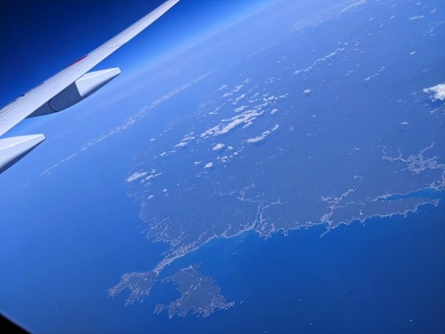紀伊半島の南端、和歌山県の潮岬や紀伊大島が見えます。本州最南端ですね!このあと、航路は太平洋上へ。窓の向こうはひたすら大海原となります。