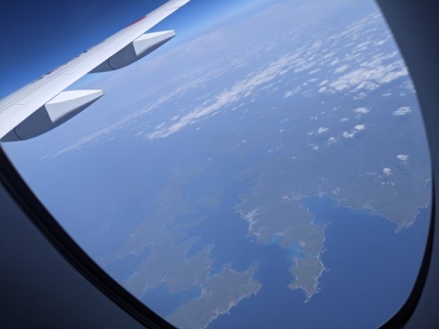 海と雲だけの世界をしばらく飛んだのち、薩南諸島へ突入。屋久島と種子島はほとんど見えませんでしたが、奄美大島あたりから高度が下がってくるためよく見えるように。加計呂麻島、徳之島、沖永良部島、与論島の島々が続いていきます。