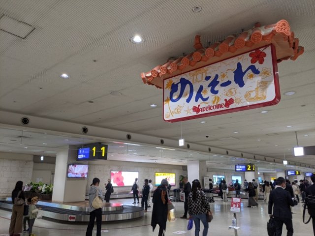 到着口に掲げられた「めんそーれ」。これを見ると沖縄ついたなぁ、って感じがします。
