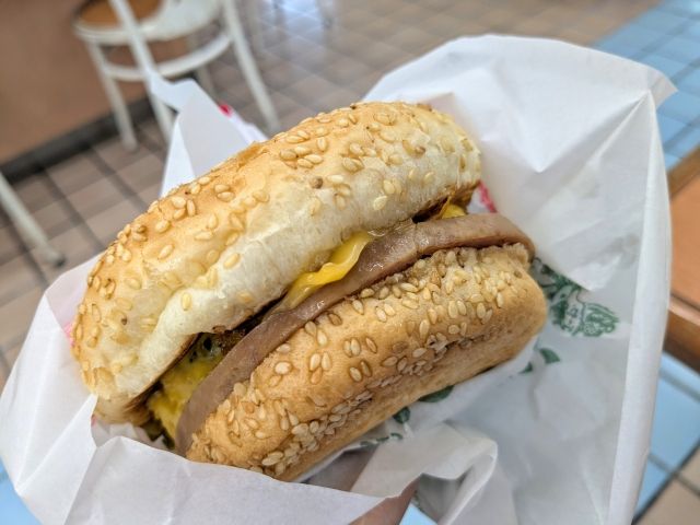 ポークランチョンミートとゴーヤの入った「ぬーやるバーガー」を食べたら、最初の目的地南城美術館に向かいます〜。