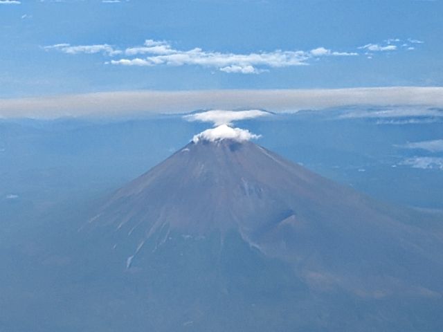離陸から少しすると見えてくるのは雄大な富士山。夏なので雪もなく赤い姿が凛々しいです。山頂部に小さな雲がかかり、さらにその上には天使の輪のような雲も。なんだかかわいらしくもありますね。